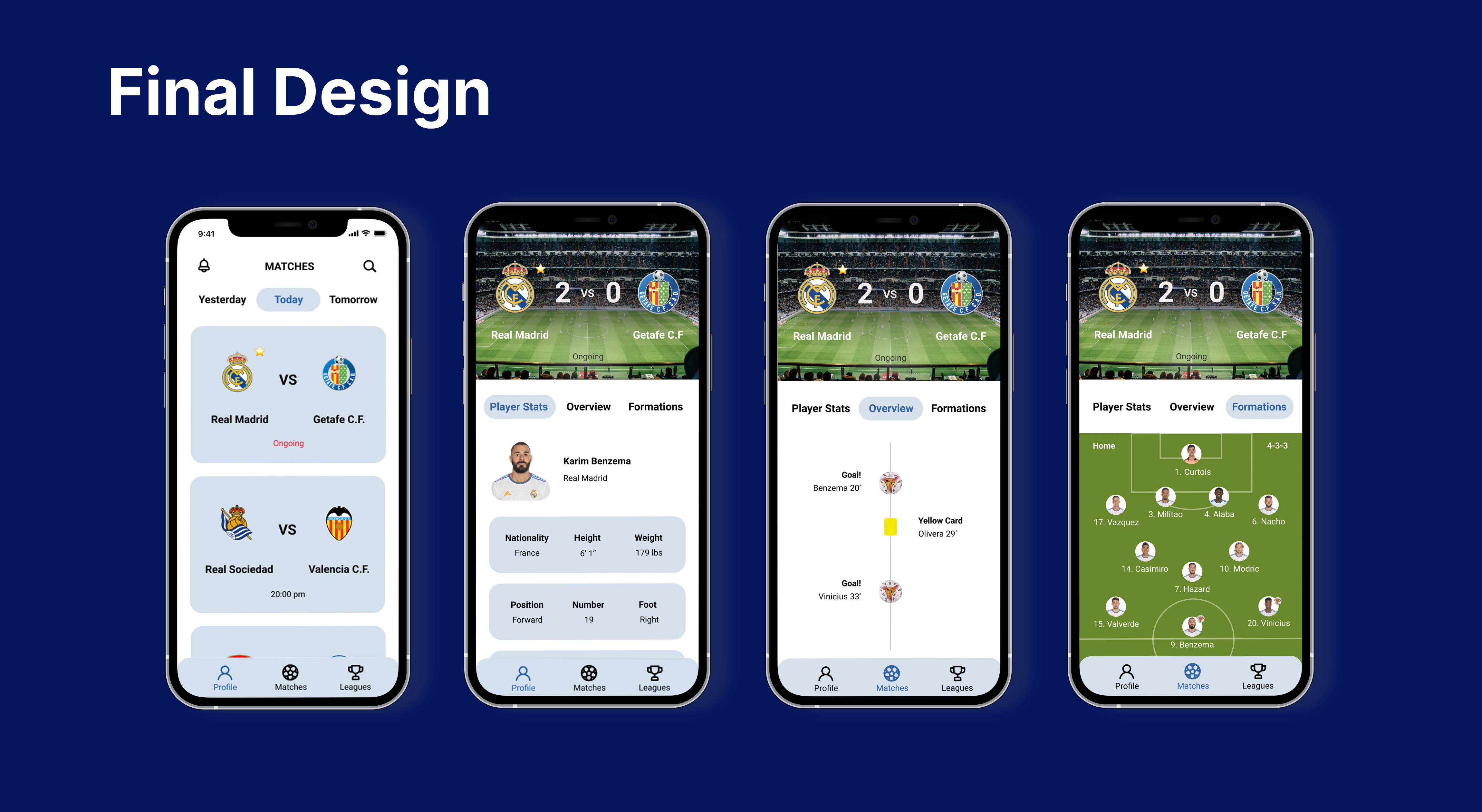 The UI emphasizes clarity with clean layouts and recognizable icons, while the UX ensures simplicity and engagement through real-time updates, customizable notifications, and personalized dashboards. By streamlining interactions, Soccer Union keeps users connected to their favorite teams and players, making it easier to stay updated and engaged with the sport.